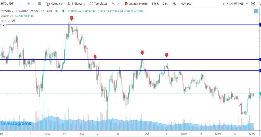 On the other hand, resistance is where prices usually hit a ceiling and start to drop. You can also draw horizontal line in those areas, and again, it doesn’t need to be exact. Resistance often works as an area of value too. Once the price touches the resistance, it tends to go down—like hitting a roof, if we were to compare it. If you’re trading futures, you can place short orders around the resistance area.